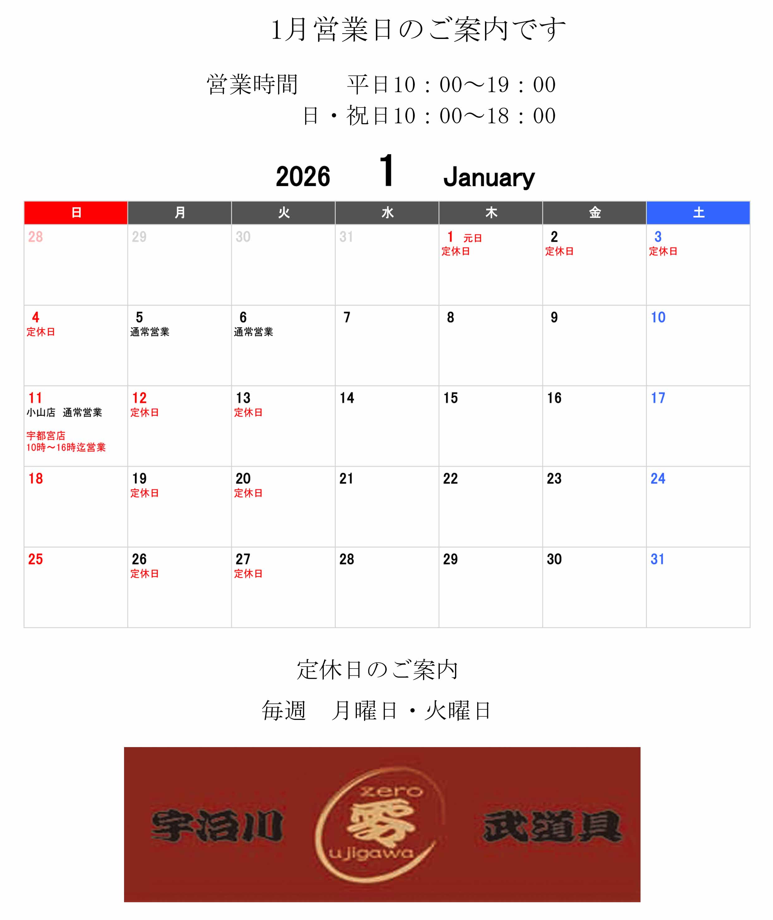 1月の営業案内