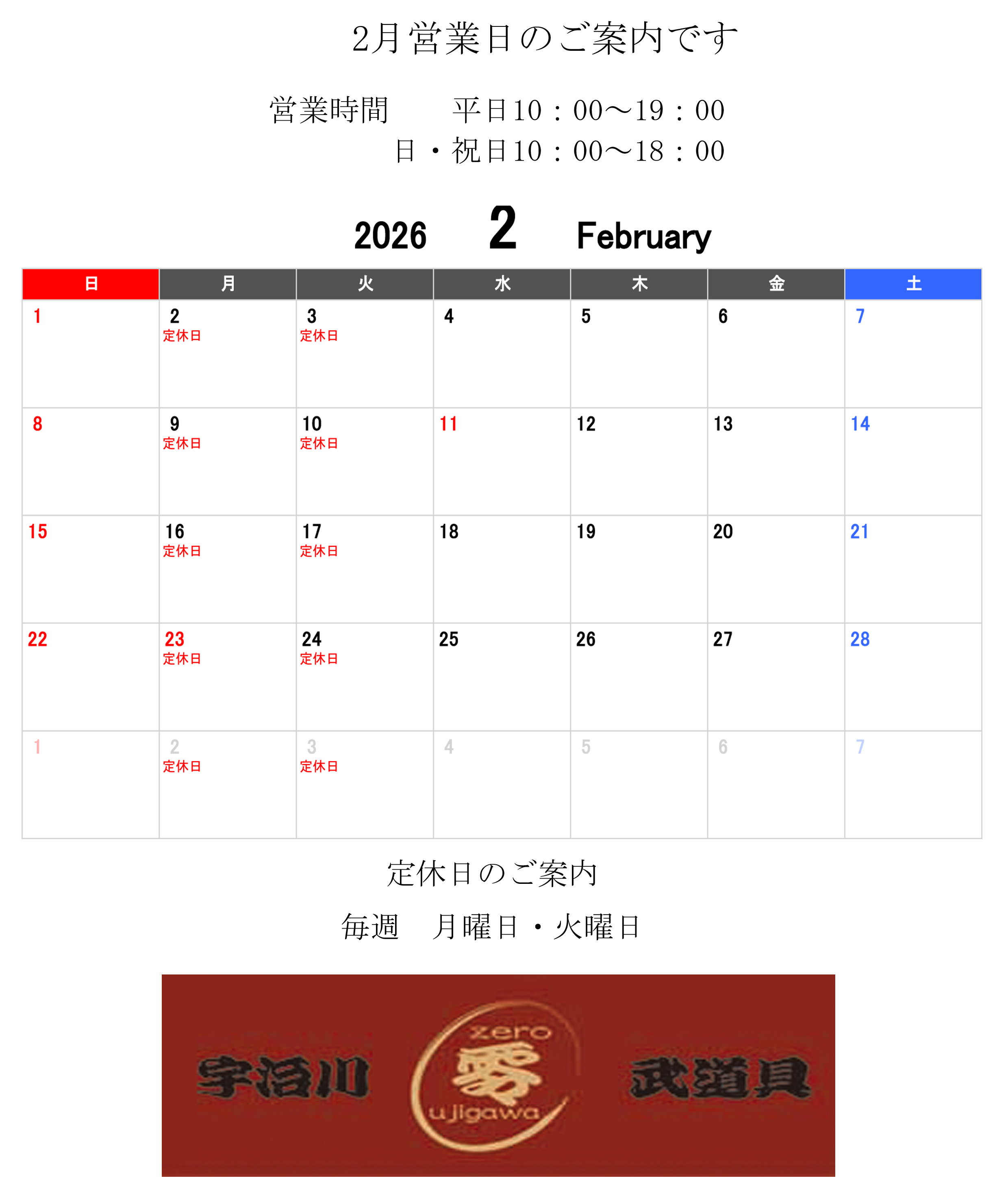 2月の営業案内