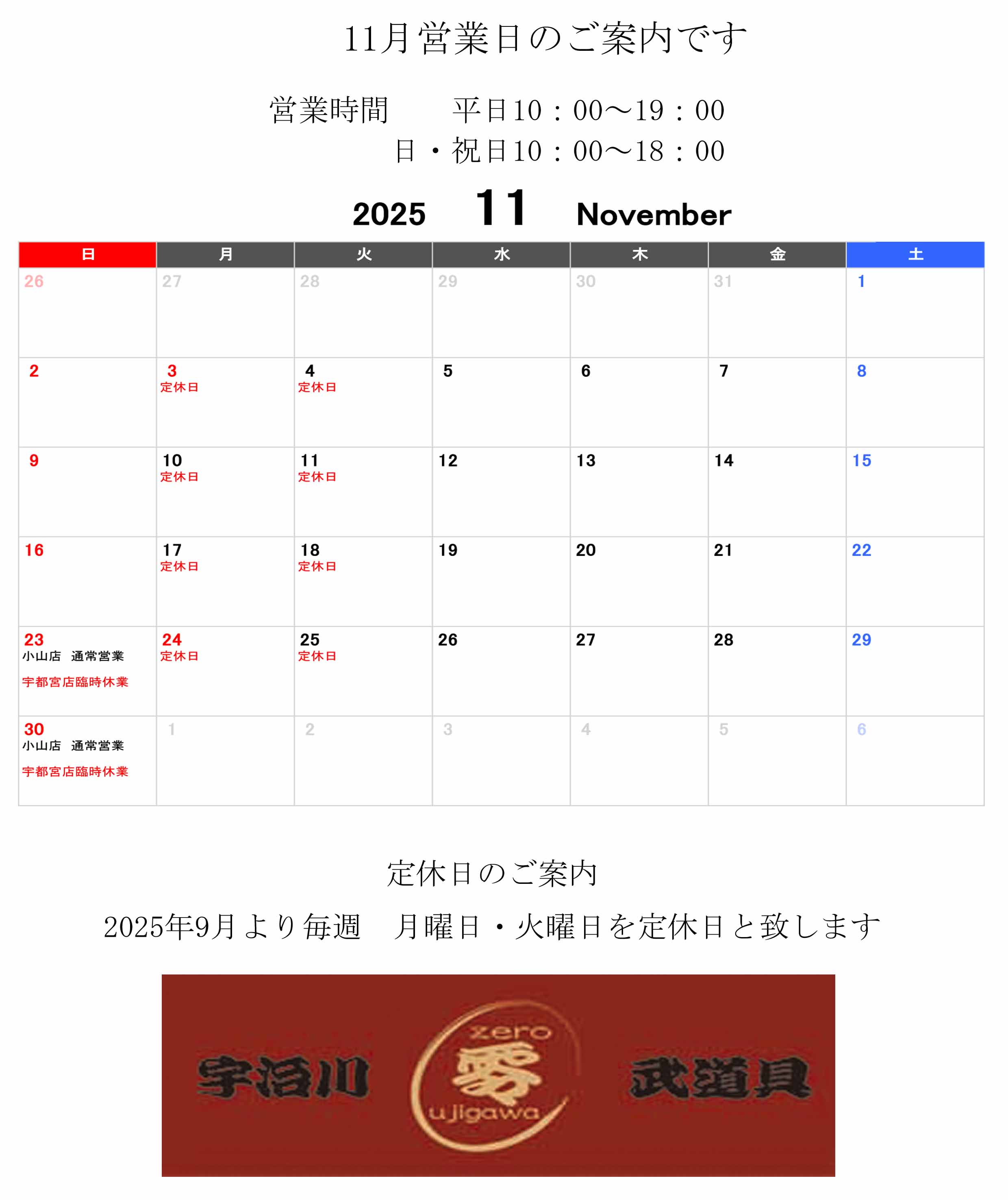 11月の営業案内
